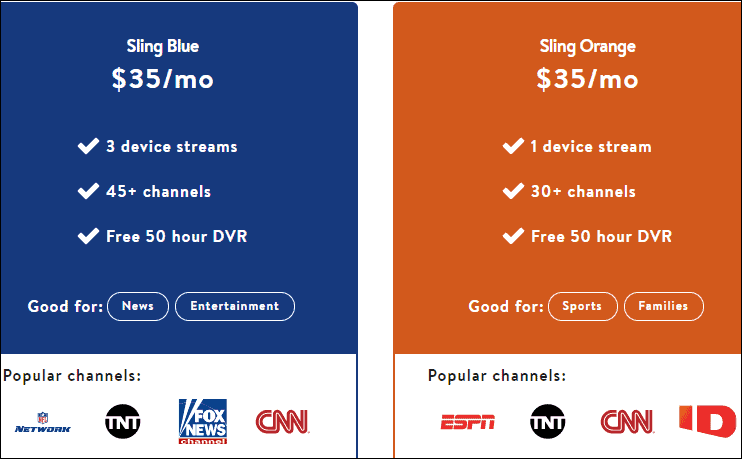 There are two packages available with Sling TV – Sling Blue and Sling Orange. What can be confusing at first sight is that both base services cost $35/ month. Sling Blue offers 3 streaming devices, 45+ live channels, and Free 50 Hour DVR recording whereas Sling Orange offers only 1 streaming device, 30+ channels, and Free 50 Hour DVR recording. So, Sling Orange should be cheaper, right? Why isn’t it? The difference is in the channels offered as both clearly offer separate things. The latter offers sporting and family channels such as ESPN, ESPN2, Disney, and Freeform that makes it more expensive than the former.