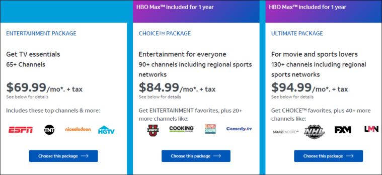 Other plans include Choice Package which retails for $84.99/month and includes 90+ channels and Ultimate Package which offers 130+ channels for $94.99/month. Both these packages include TNT, and they also offer HBO Max for a year.