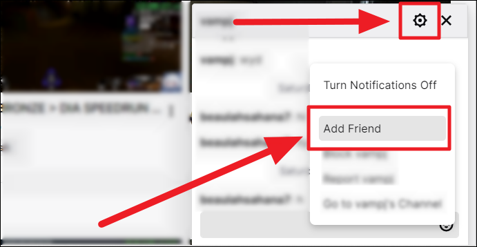 On desktop app. To add the person you’re whispering to as a friend, click the ‘Settings’ button (gear icon) to the top right of the chatbox ribbon. Select ‘Add friend’ from the settings options.