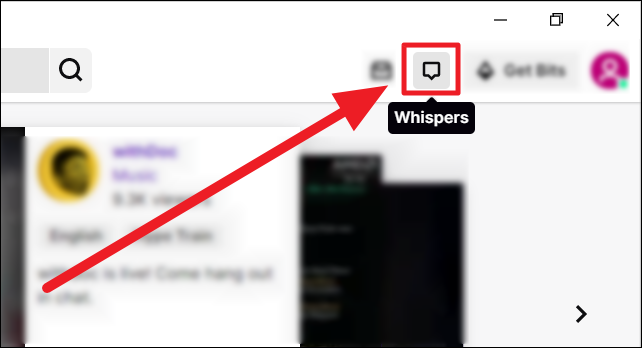 Launch Twitch on your computer and click the ‘Whispers’ button with a pointy speech bubble to the top right corner of the screen.