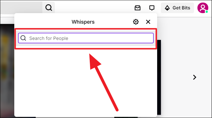 Type the username of the person you want to whisper to in the ‘Search for people’ text field. Click to choose the appropriate search result to begin a chat.