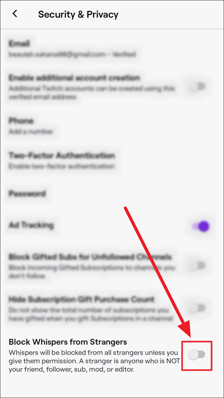Navigate the ‘Block Whispers from Strangers’ option on the following ‘Security and Privacy’ screen. It will typically be the last option on the screen. Tap the toggle on this option, and ensure the toggle is purple and not grey. This indicates that whispers from strangers will be blocked henceforth.