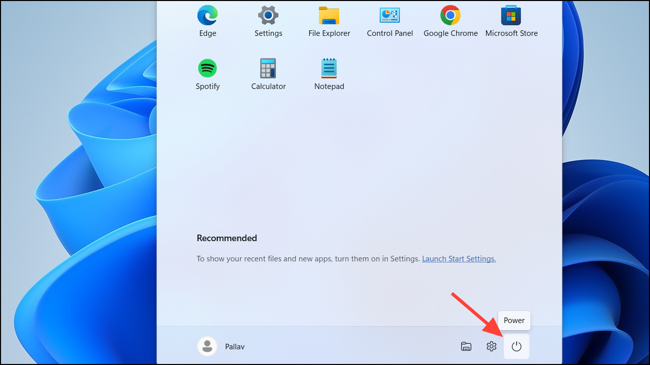 Step 2: Click on the Start button in the taskbar and select the Power icon.