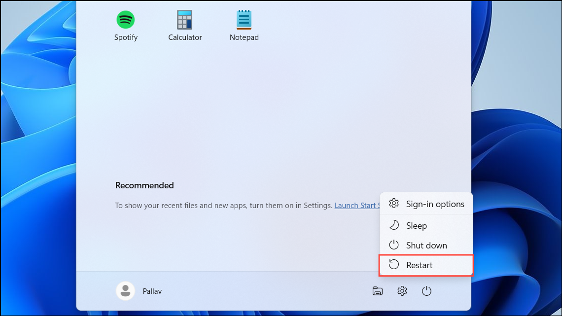 Step 3: Choose Restart from the options to reboot your computer.