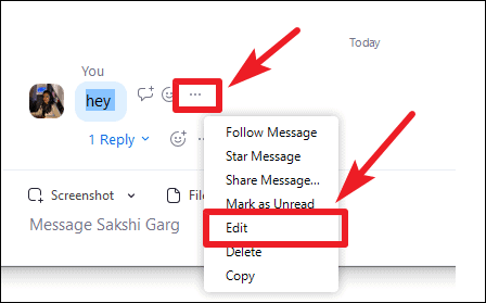 Go to the message you want to edit, and a few options will appear on the right of the message as soon as the cursor starts hovering on the message. Click the ‘More’ option (three dots), and select ‘Edit’ from the pop-up menu. Edit your message and click ‘save’ to successfully rectify those mistakes.