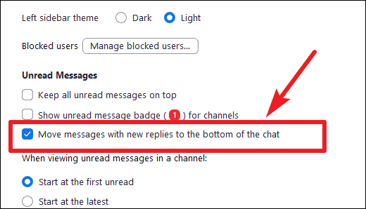 Go to Zoom settings, and open ‘Chat’ settings from the navigation menu on the left. Under the ‘Unread messages’ section, select the option for ‘Move messages with new replies to the bottom of the chat’. It will prompt you to restart the Zoom app to change this specific setting and apply the changes.