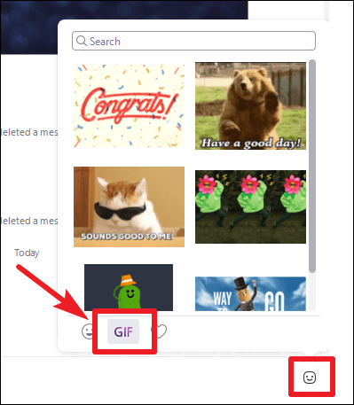 The GIF button in Zoom chat is accessible from the emoji picker. Click on the ‘smiley face’ icon on the right corner of the message field and switch from emojis to GIFs by clicking on the ‘GIF’ option.