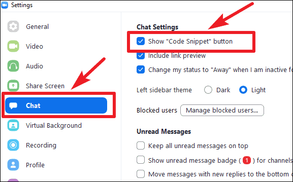 First, you’ll need to enable Code Snippets for the chat. Go to Zoom Settings from the main screen of the app, then open ‘Chat’ settings from the navigation bar on the left. Check the option for ‘Show Code Snippet button’. It saves the changes automatically.