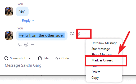 To mark the message as unread, click on the ‘More’ option (three dots) next to the message and select ‘Mark as Unread’ from the context menu.