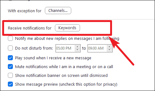 To turn on notifications for messages containing certain keywords, go to Zoom settings. Then under Chat settings, scroll down to go to the ‘Receive notifications for’ option and specify the keywords. You can specify as many keywords as you want and they are not case sensitive either.