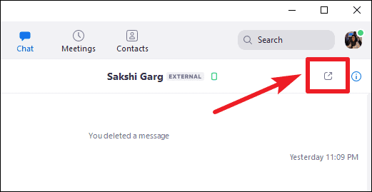 To pop the Zoom chat, click on the ‘Open in New Window’ button (the square with an arrow coming out) from the toolbar at the top of the Chat window that has the recipient’s name. You can pop it back in the same way.
