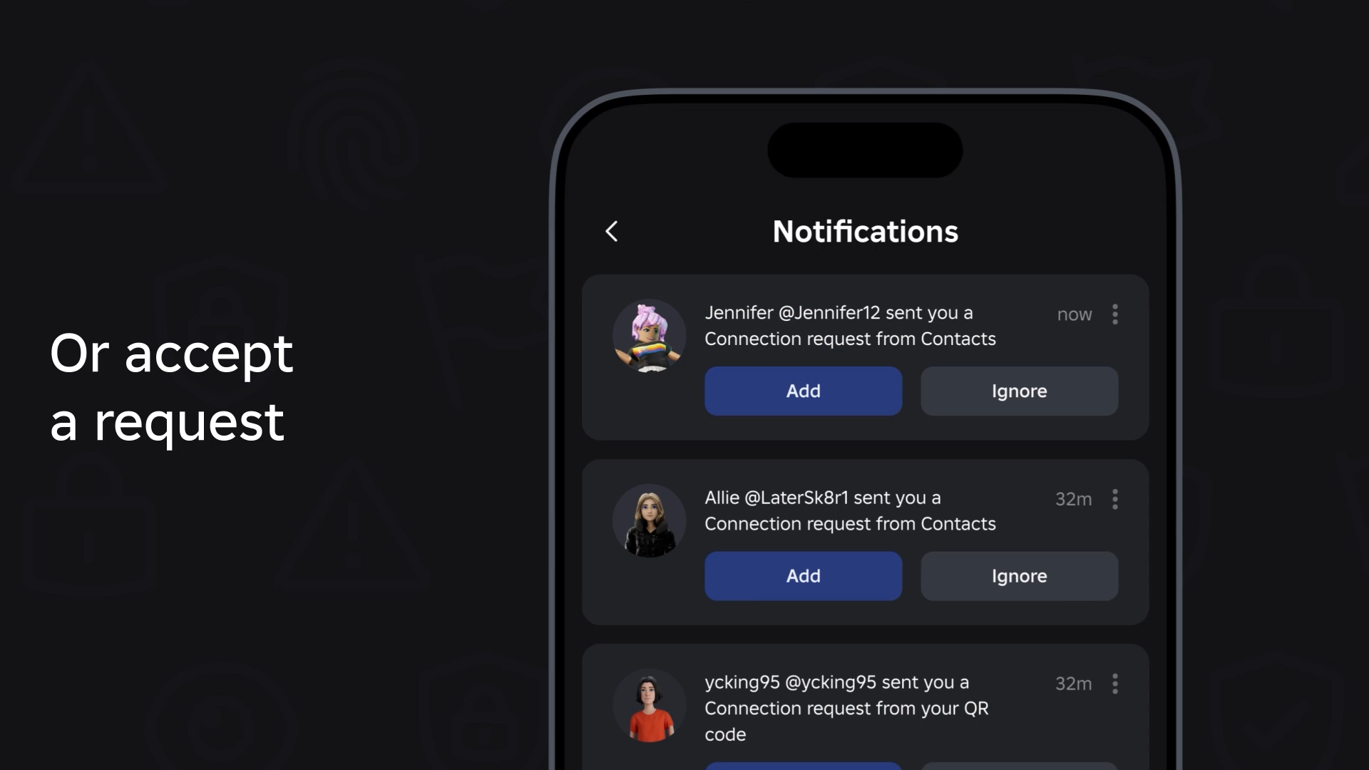 Step 5 (QR code method): Generate your QR code and have your friend scan it from their app, or scan theirs from your device. When both of you are 13–17 and age‑checked, this QR‑based connection can become a Trusted Connection once you both accept.