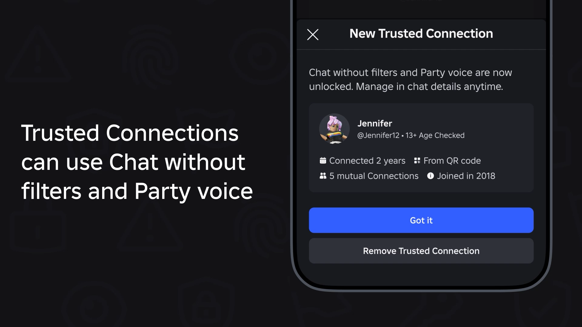 Once that’s in place, Trusted Connections are what unlock expressive chat features for most teens, including Party Voice and chat without filters in eligible chats and Parties.