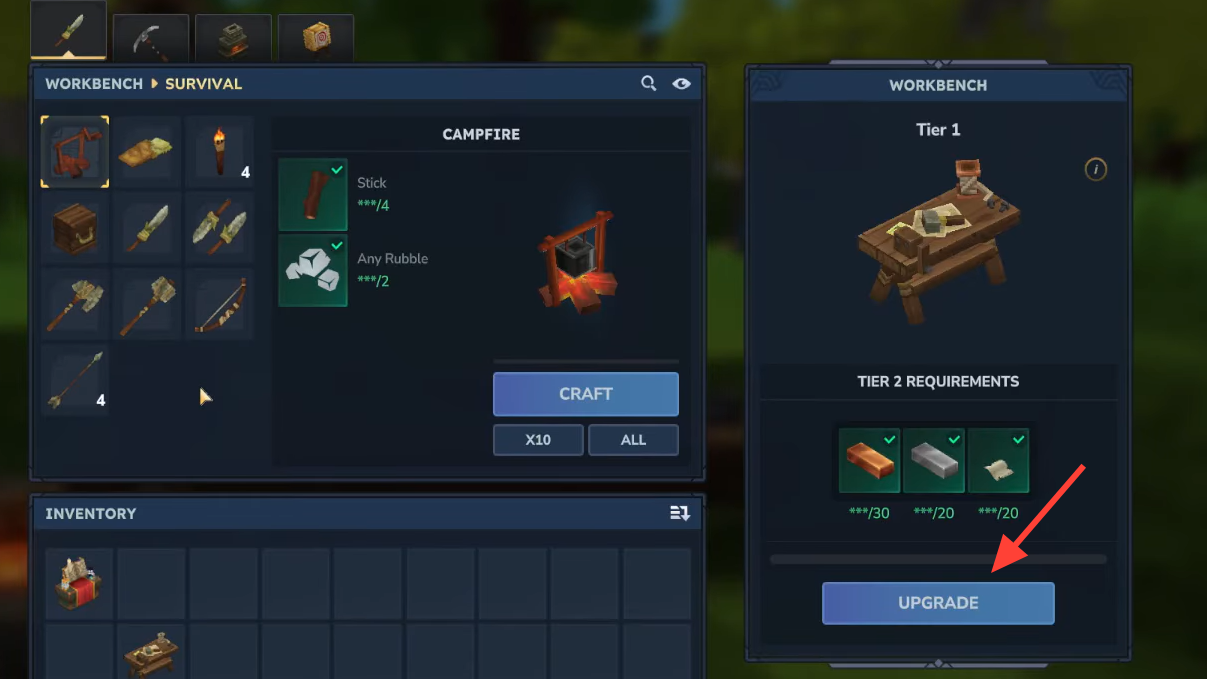 Step 1: Upgrade your basic Workbench to Workbench Tier 2. This requires 30 Copper Ingot, 20 Iron Ingot, and 20 Linen Scraps. You upgrade the Workbench directly rather than crafting a separate item.