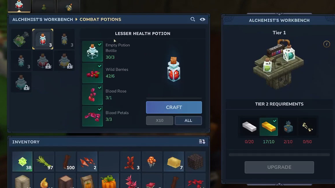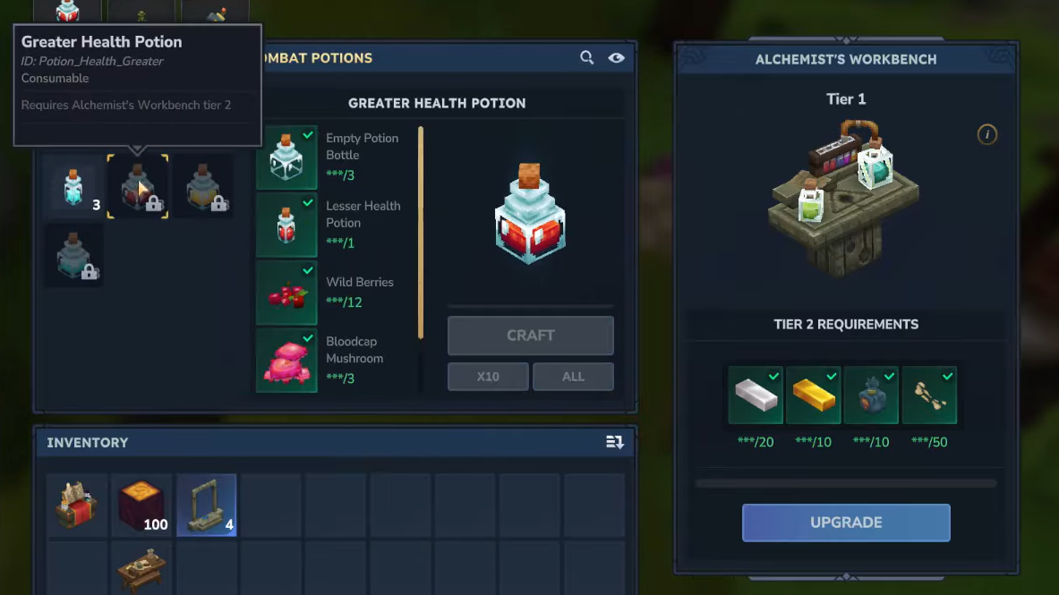 | Greater Health Potion | Stronger version of the Lesser Health Potion. Exact numbers are not surfaced in-game yet. | 3x Empty Potion Bottle, 1x Lesser Health Potion, 12x Wild Berries, 3x Bloodcap Mushroom | Tier 2 |