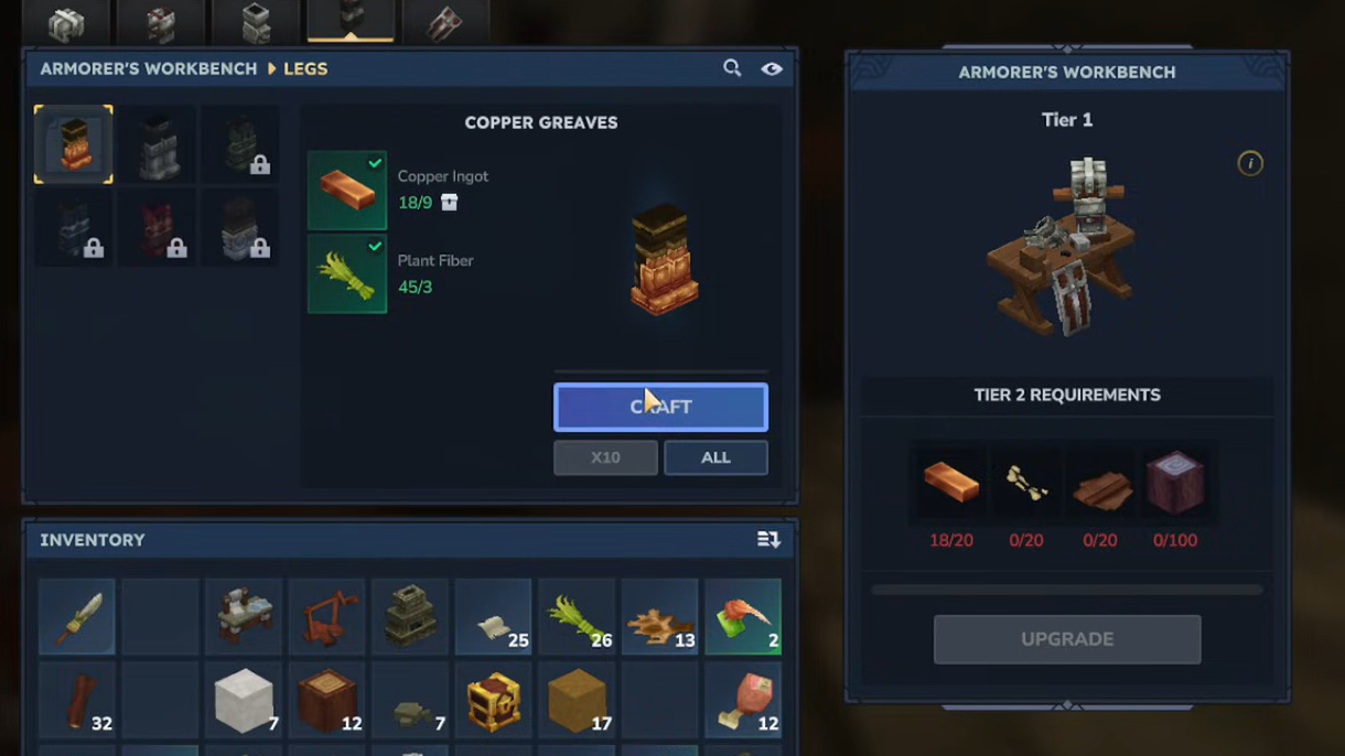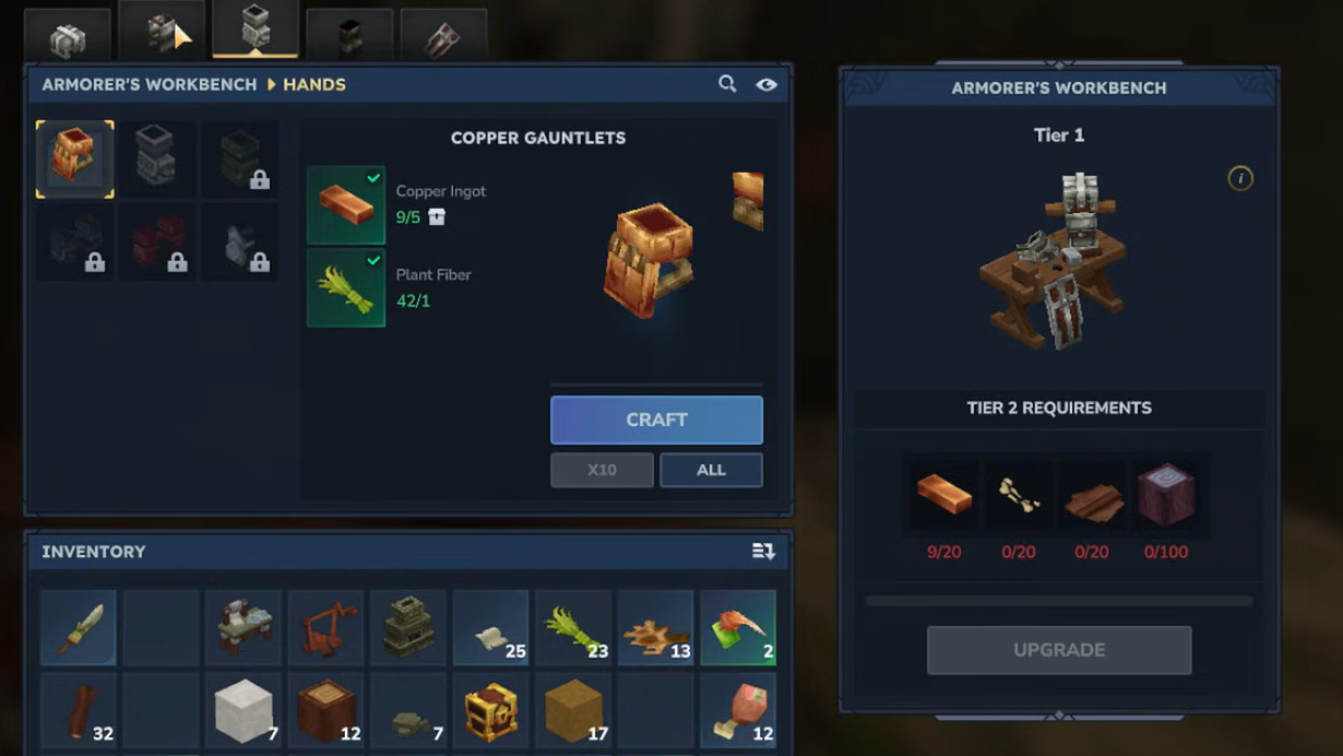 Step 1: Use a normal Workbench and select the recipe for the Armorer’s Workbench. Provide 2 Copper Ingots, 10 Tree Trunks, and 5 Stone.
