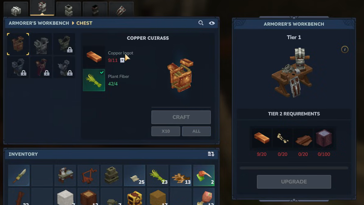 On a Tier 1 Armorer’s Workbench, you can craft Copper and Iron gear once you have refined ingots. Higher-tier armor (Thorium, Cobalt, Adamantite, Mithril) requires upgraded versions of the Armorer’s Workbench (Tier 2 and Tier 3), as well as rarer supporting materials like better leathers, special cloths, and Essence of the Void.