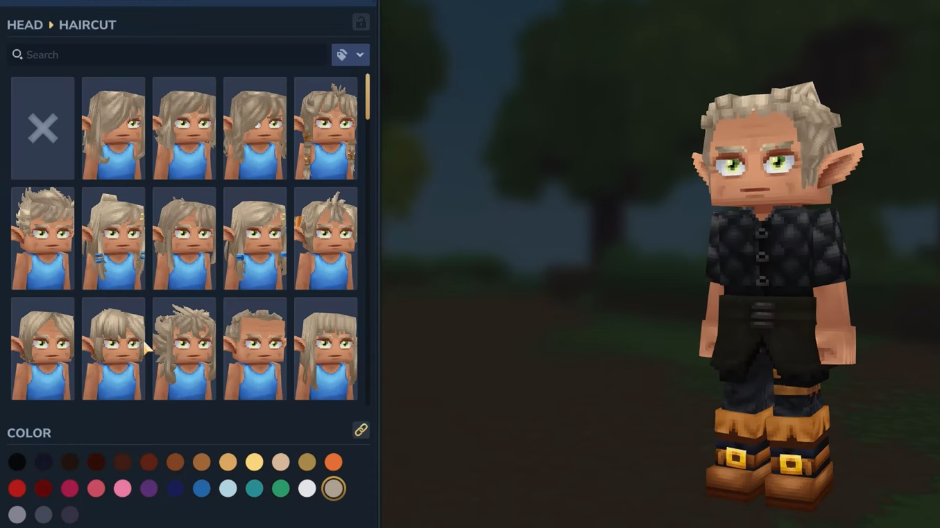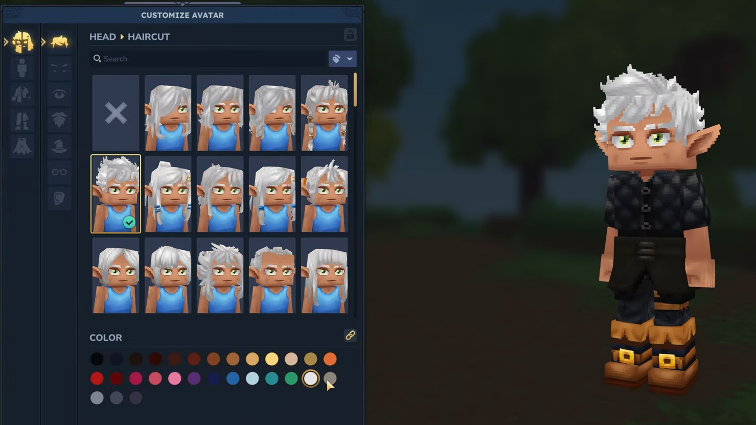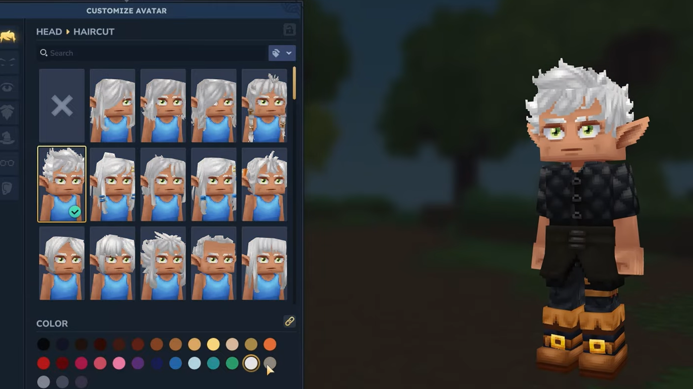 You pick a hairstyle, then select a color. The palette supports a broad range, from natural browns and blondes to more saturated fantasy shades. Color choice applies cleanly because of Hytale’s higher texture density for characters, which preserves small details like strands, streaks, or dyed tips without turning the face into a blocky blur.