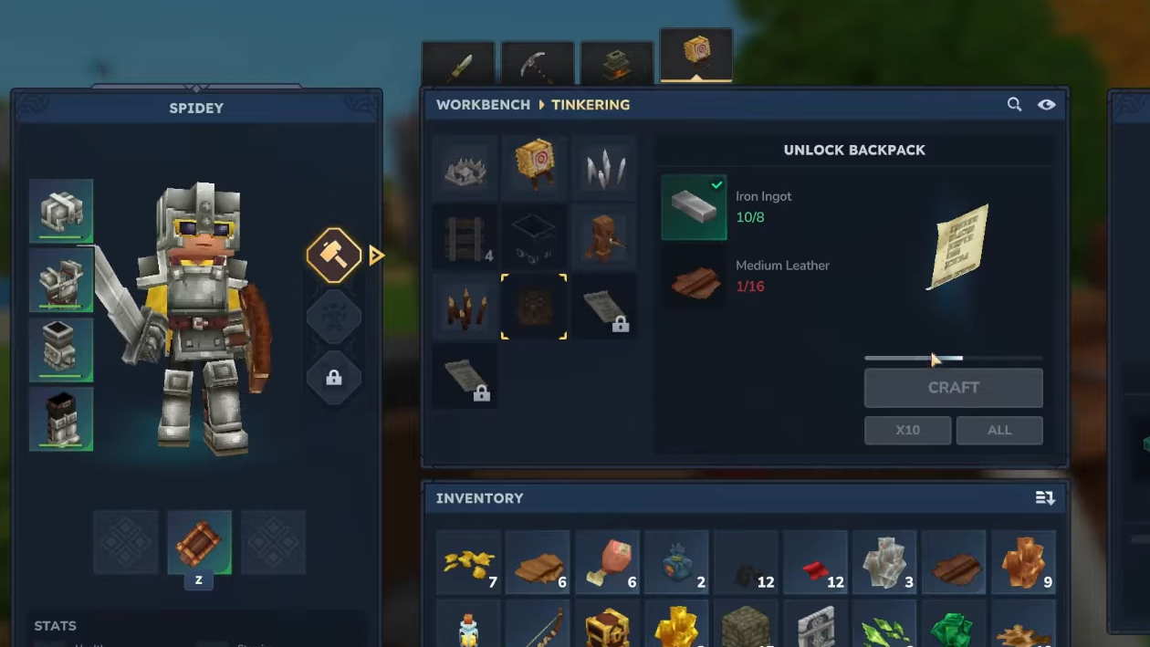 The Backpack unlock itself is crafted from iron and leather in the Tinkering section of the Workbench UI.