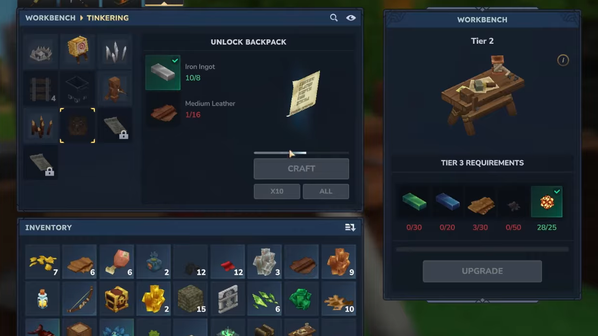 You cannot craft the initial backpack unlock until your Workbench reaches Tier 2. Upgrading the bench itself requires three kinds of resources: copper, iron, and linen scraps.
