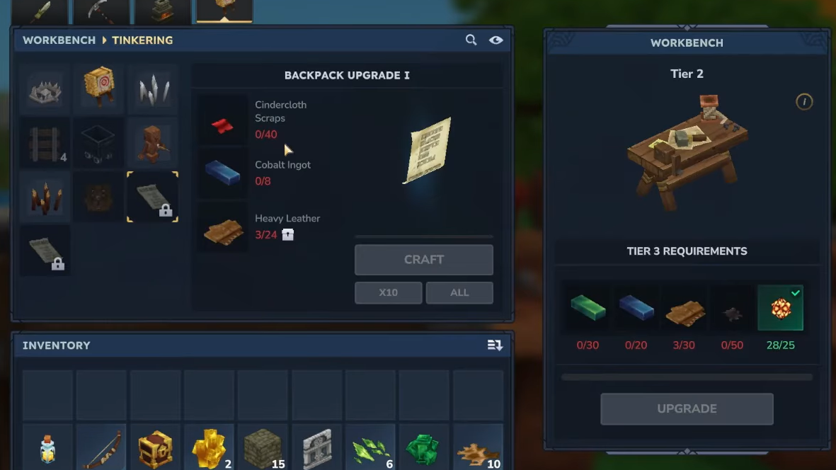 Step 3: Interact with your Tier 3 Workbench, open the Tinkering tab, and craft Backpack Upgrade 1 with 40 cindercloth scraps, 24 heavy leather, and 8 cobalt ingots.