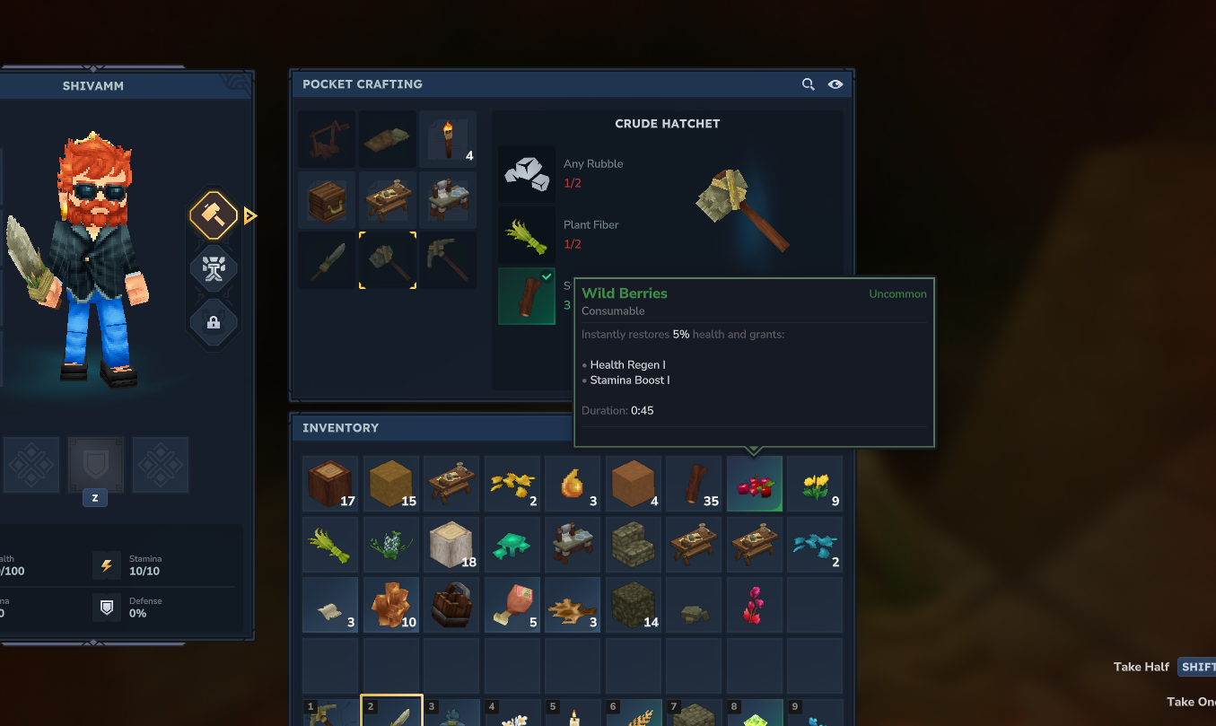 Step 2: Use pocket crafting from your inventory to create a Crude Hatchet, Crude Pickaxe, and Crude Sword. These tools and your first weapon let you harvest logs and stone more efficiently and end early fights faster, which keeps health losses low.