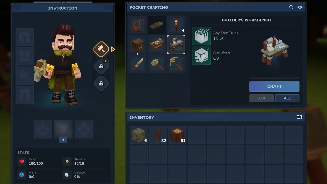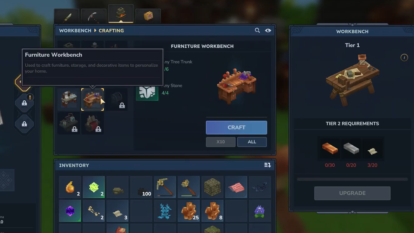 Step 1: At a standard Workbench, craft a Furniture Workbench using any stone and any tree trunk. The recipe requires six of each material.