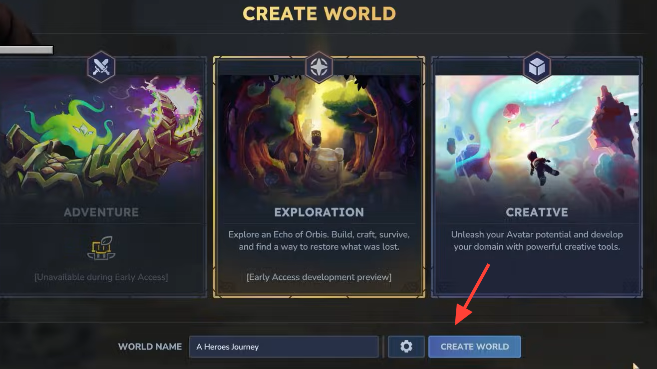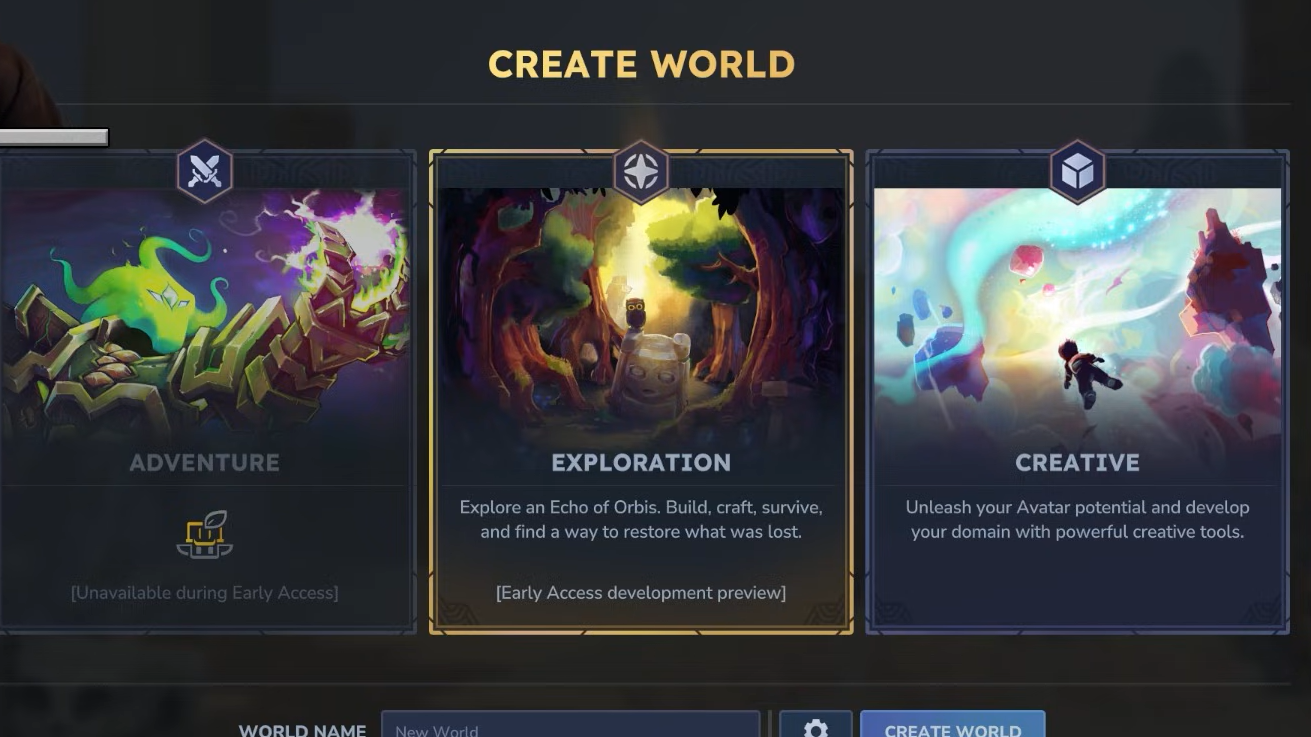 Step 3: Choose the game mode for the new world. During Early Access you will see Exploration and Creative as playable options, while Adventure is listed but unavailable.