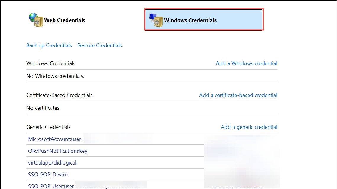 Step 2: Select the Windows Credentials tab. Look for entries labeled as TERMSRV/hostname or TERMSRV/IP address. These entries store saved RDP credentials for specific hosts.