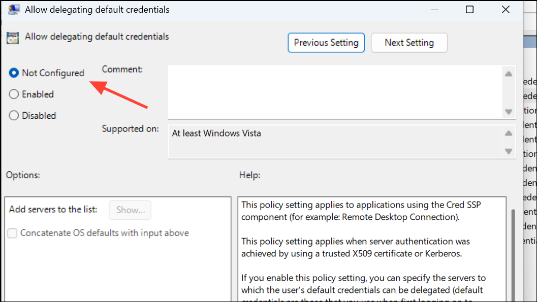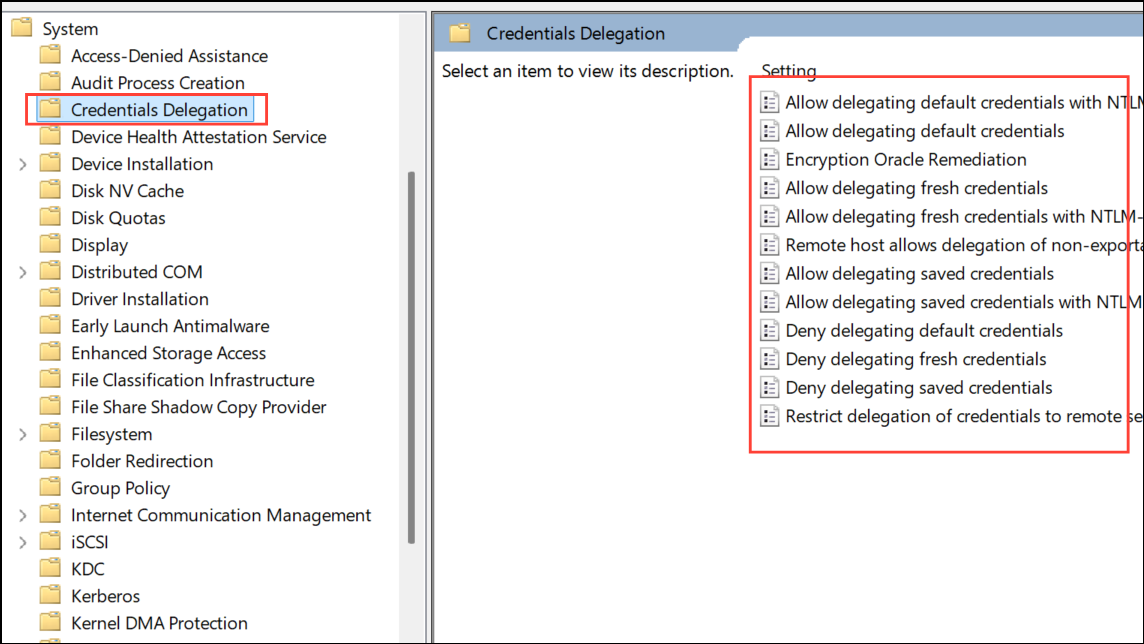 Step 3: Double-click on each policy to review its settings. If the policy is enabled and lists your target server, consider setting it to Not Configured or Disabled to prevent credential delegation.