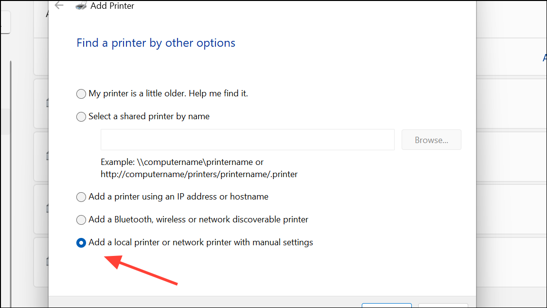 Step 4: In the manual add wizard, choose Add a local printer or network printer with manual settings. Click Next to continue. On the next screen, select the appropriate port. For most USB printers, select the port labeled USBxxx (where xxx is a number). If you are unsure, unplug and replug the printer to see which port appears.