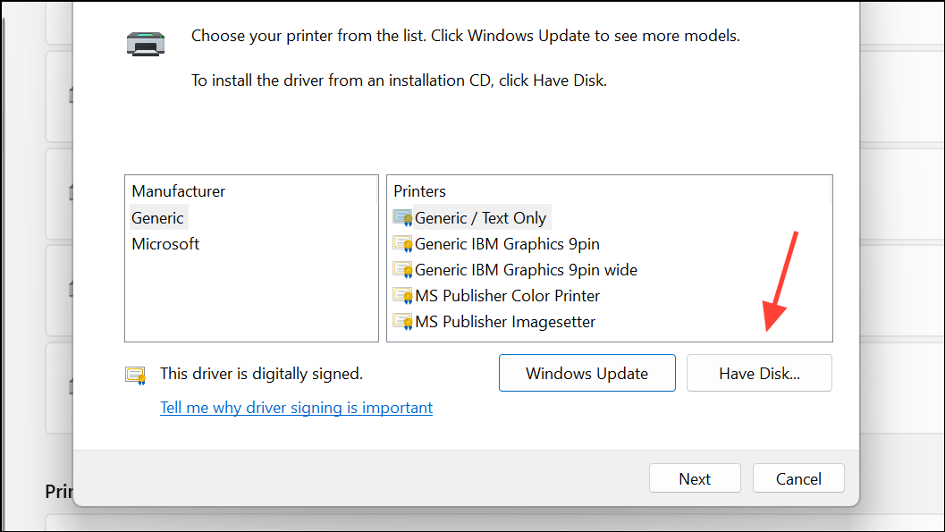 Step 5: Choose your printer manufacturer and model from the list. If your printer is not listed, click Windows Update to refresh the list of available drivers. This step can take several minutes. If the driver remains unavailable, click Have Disk and browse to the location where you downloaded the driver from the manufacturer’s website. Using the exact driver for your printer model avoids compatibility problems and restores full functionality.