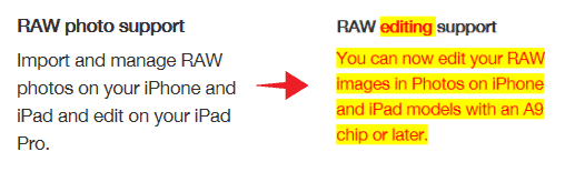 Apple today updated the iOS 12 features page with “RAW editing support” for all iPhone and iPad devices with an Apple A9 chip or later. The company made these changes right after releasing iOS 12 Developer Beta 3.