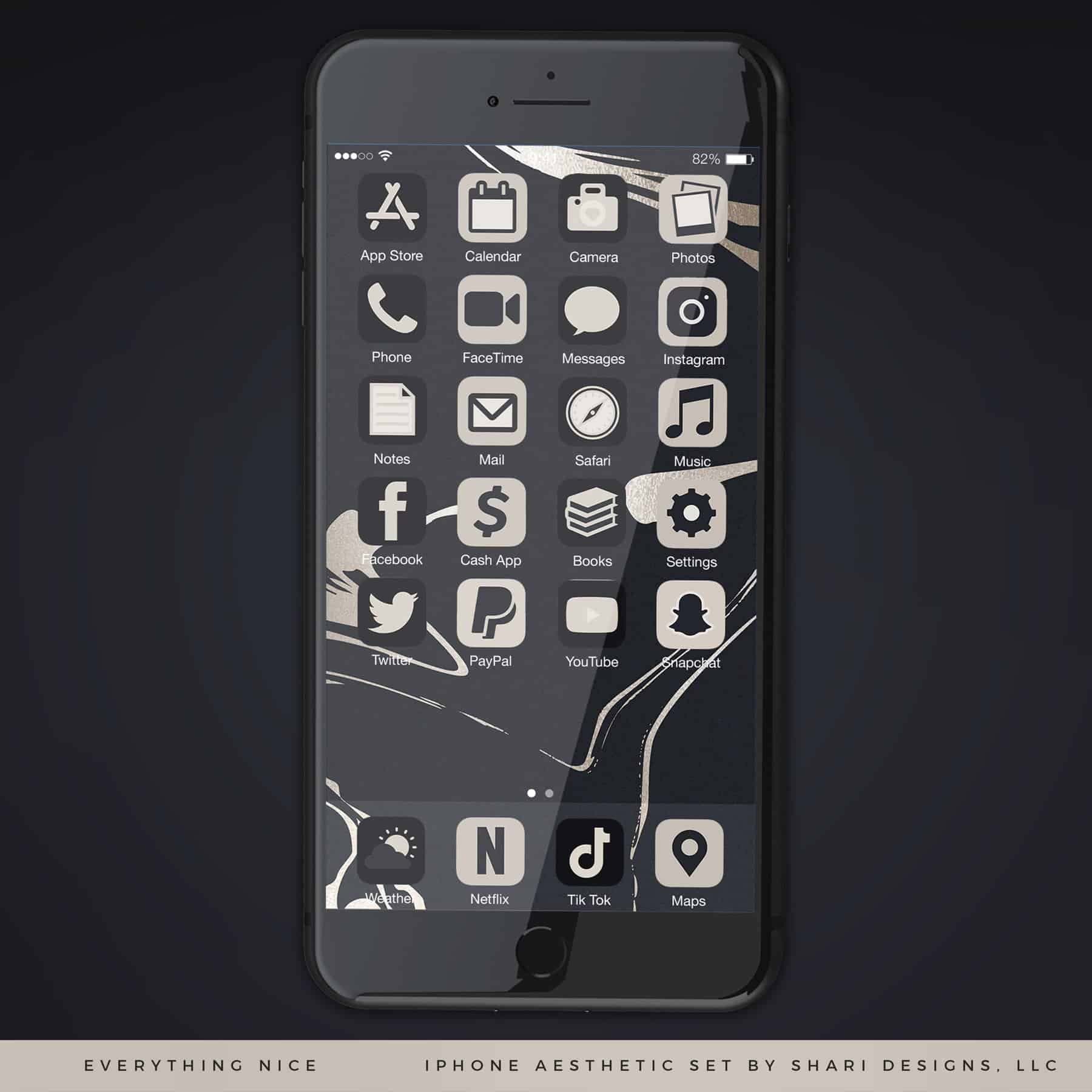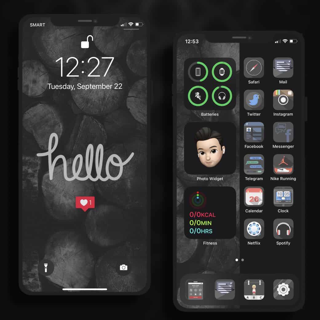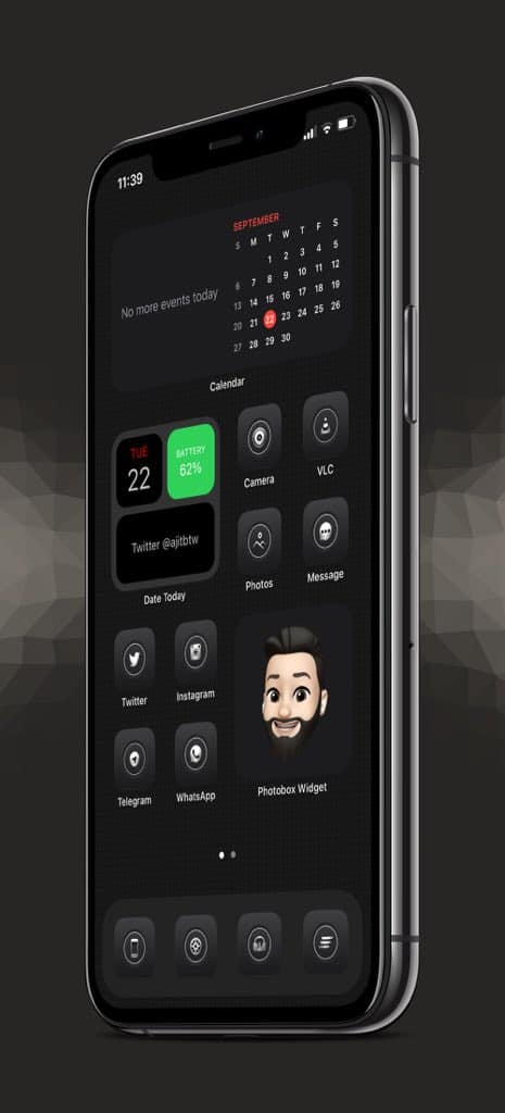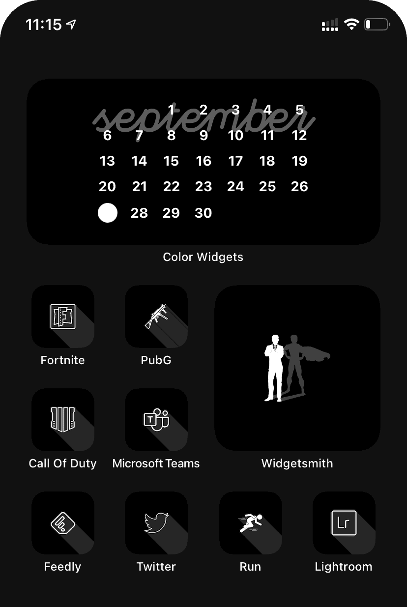 Black aesthetic home screen created with shadow effect iOS 14 icons.
