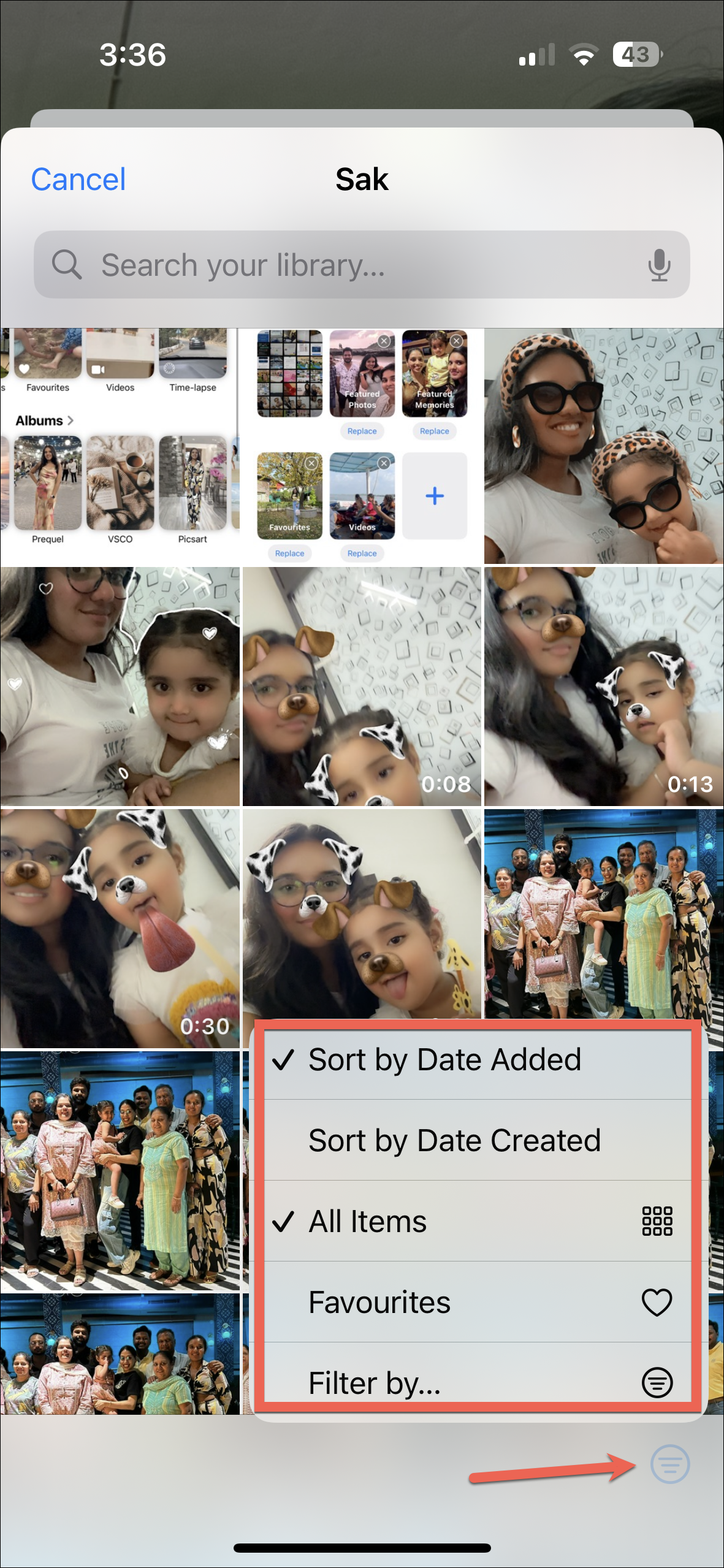 - Next, you can choose to show only favorites or sort items by date added or date created. For further options, tap on 'Filter by'.