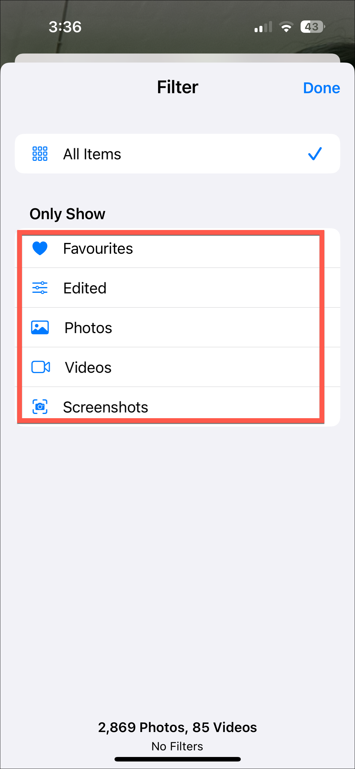 - You can then choose filtering options like 'Edited', 'Screenshots', 'Videos', etc.