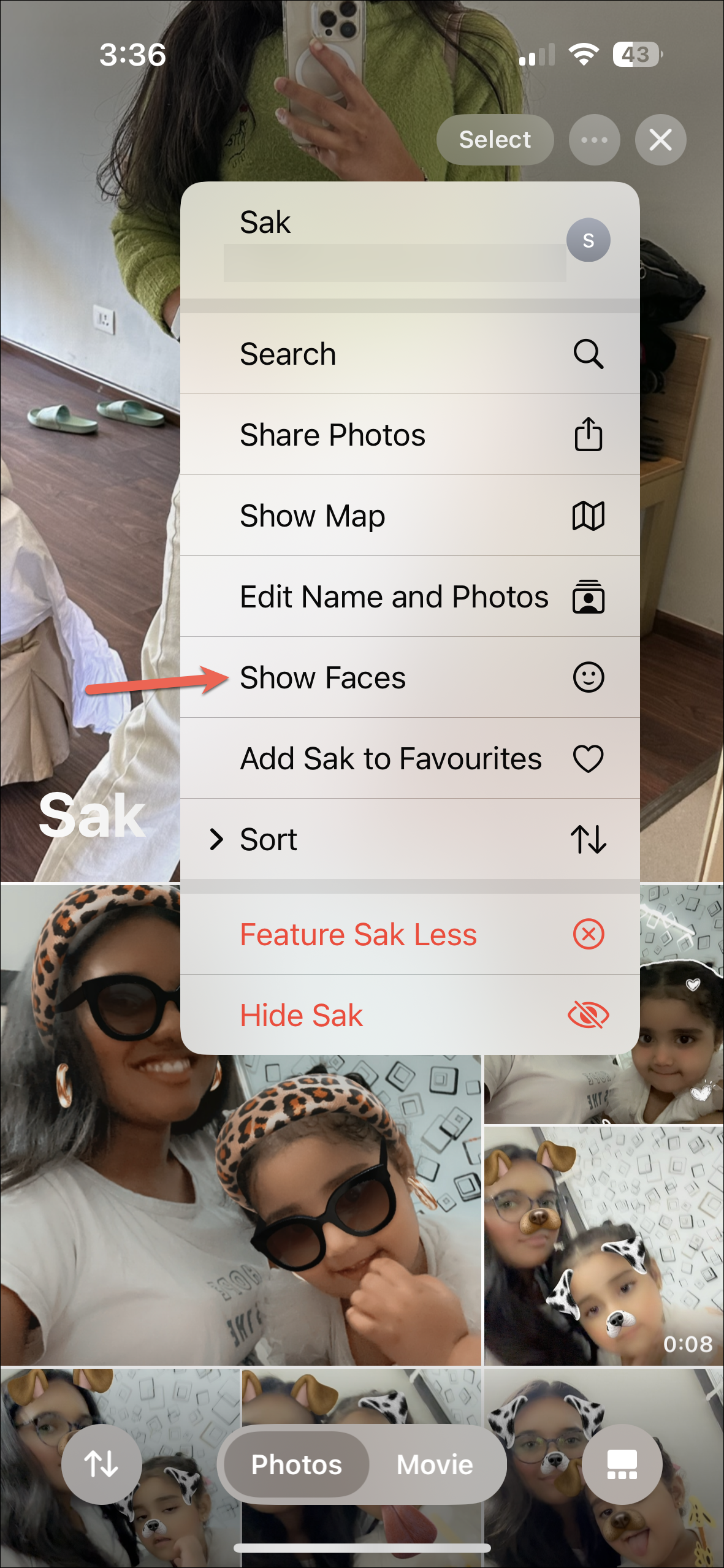 - To get an idea of which photo would look good as the Key Photo, tap on the 'three-dot menu' and select 'Show Faces' from the options. Now, some photos won't look as good (the quality will be degraded severely) as they'll have to be cropped more when chosen as the Key Photo. But this step is completely optional.