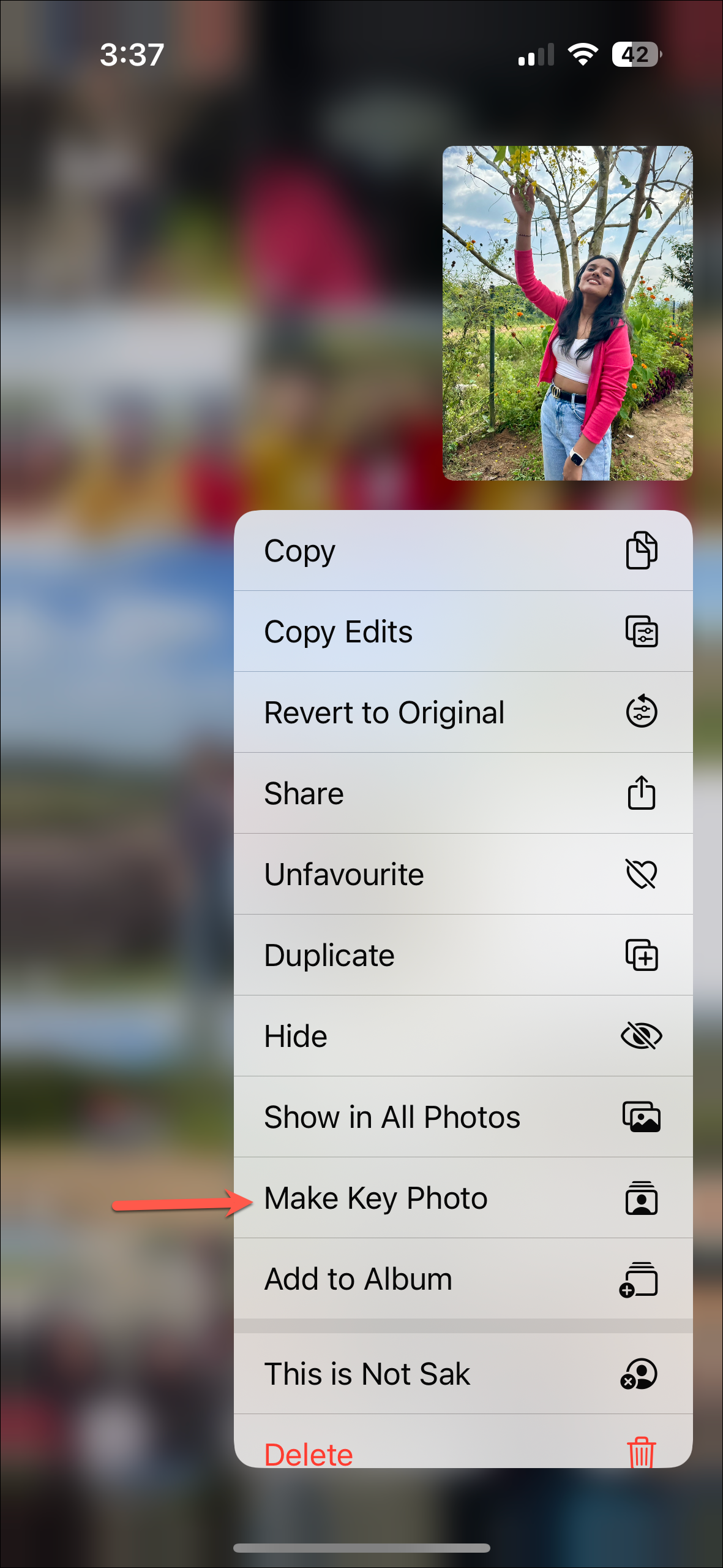 - Then, tap and hold the photo you want to use as the Key Photo and select 'Make Key Photo' from the menu.