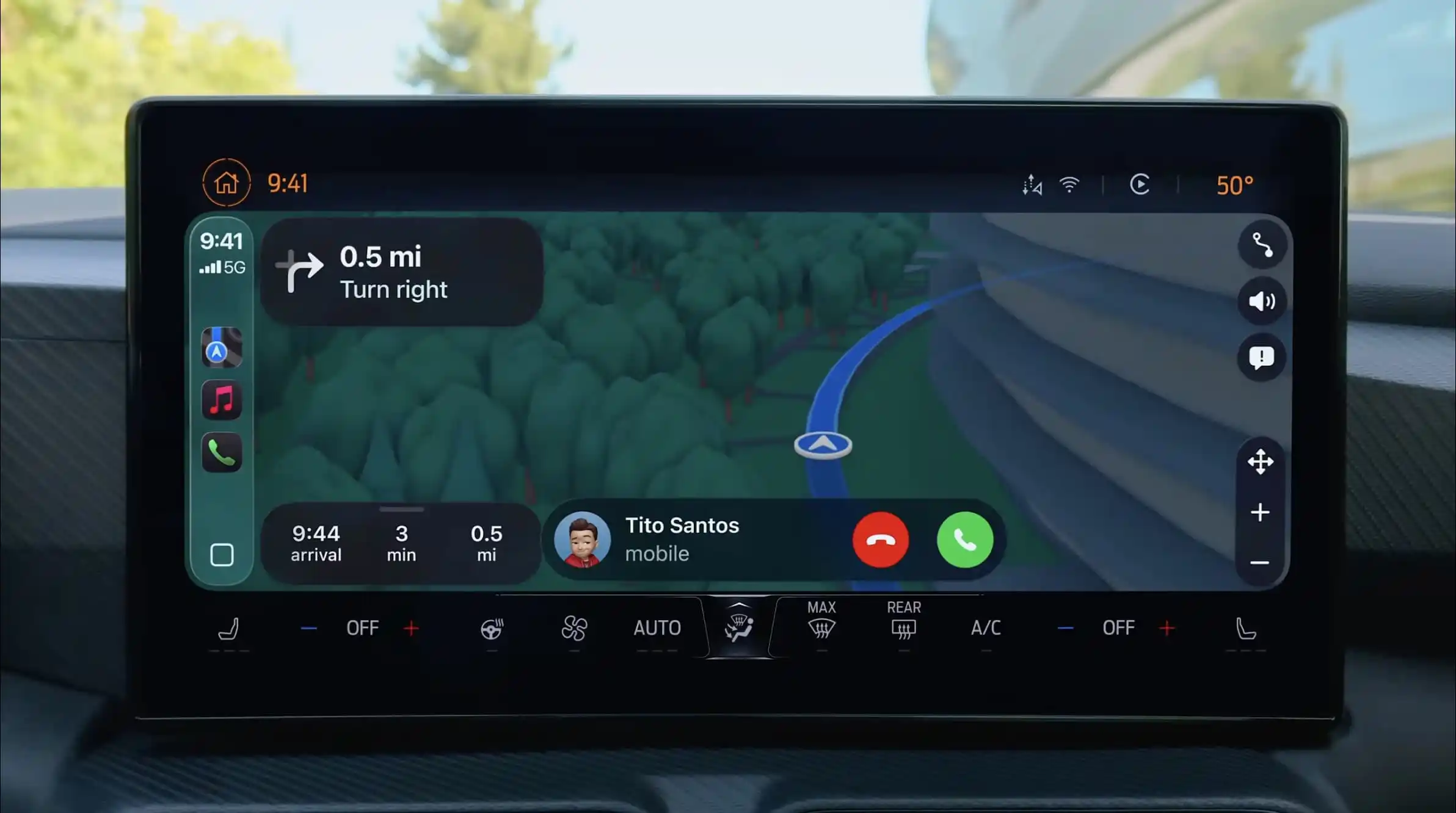 Incoming and active calls now appear in a compact view rather than a full-screen takeover. You can see who’s calling and still keep critical information — like turn-by-turn directions — in view. It’s a small UI change with a big impact: fewer missed prompts and less context switching while driving.