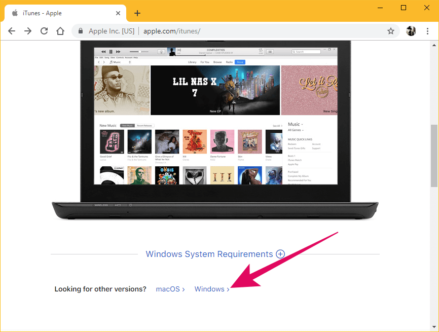 To get iTunes directly from Apple’s website, open apple.com/itunes/ link on your Windows PC. Do NOT click the Microsoft Store link, instead scroll down on the page a little and click “Windows >” link under the “Looking for other versions?” section to reveal the direct download links for iTunes.