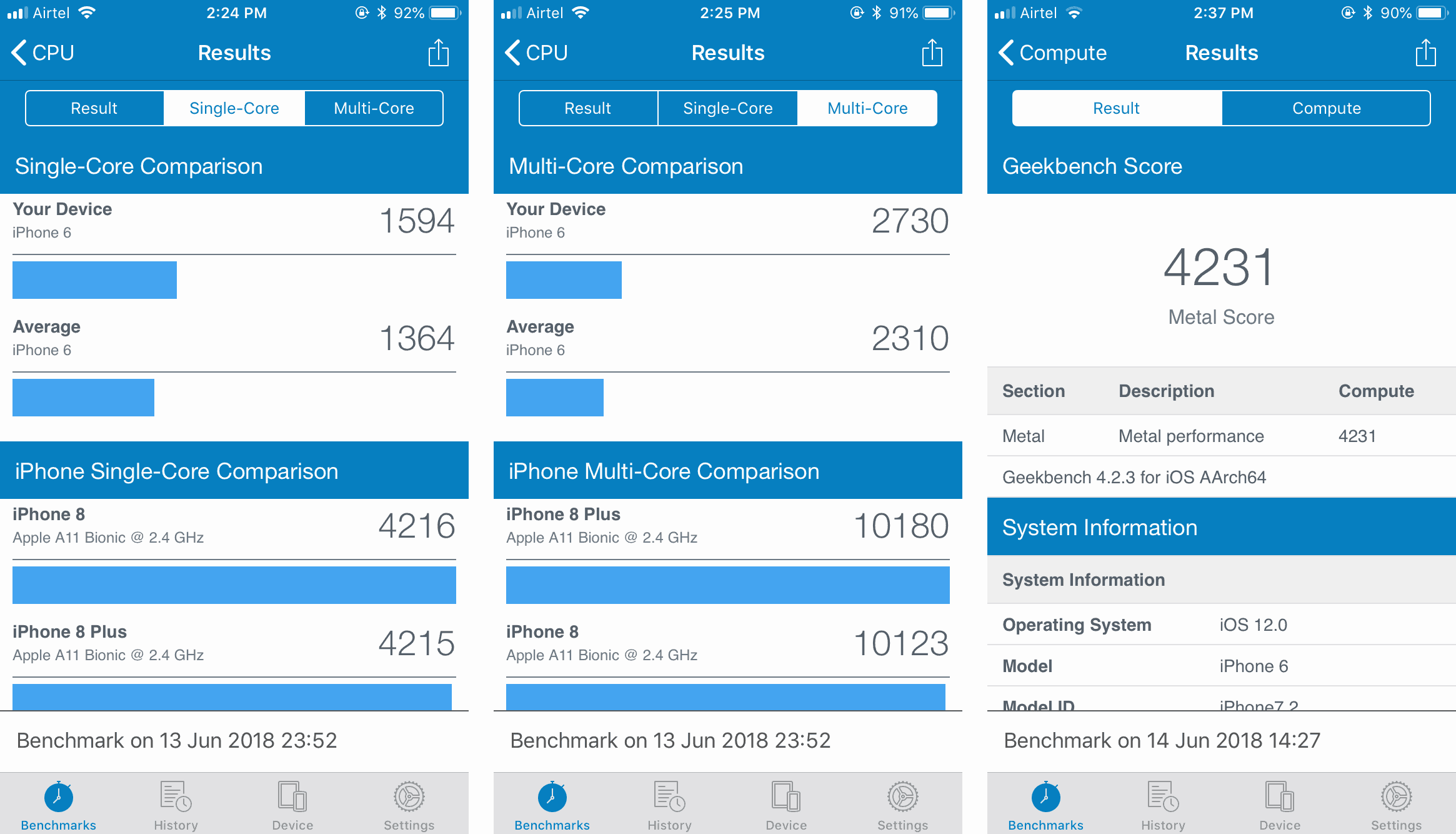 The GeekBench scores also significantly improve on the iPhone 6 after installing iOS 12. Check out the difference in GeekBench scores of iPhone 6 running iOS 12 versus average iPhone 6 scores.