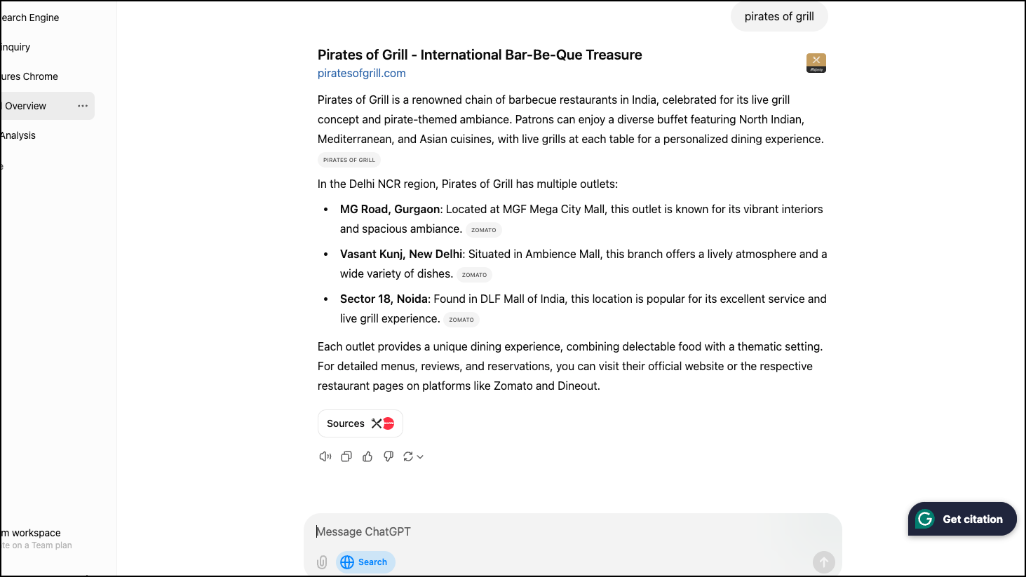 In the case of ChatGPT however, it ended up giving me information about the other chains of the restaurant in faraway cities, without any mention of the one in my own city.