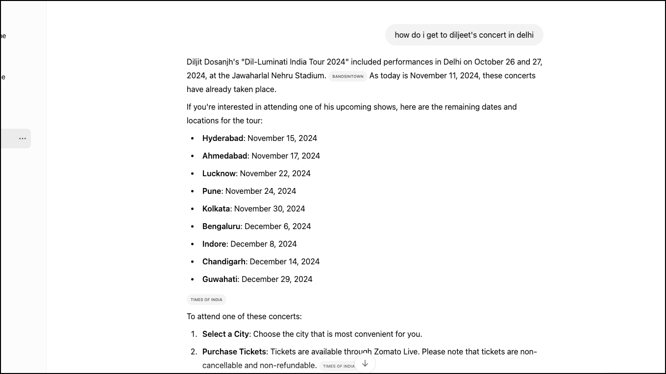 I decided to test it with a little tricky query and asked it how could I get to Diljit's concert venue in New Delhi. Now, by the time I asked ChatGPT about this, the concert was already over. But ChatGPT handled it gracefully. It told me where the concert was held, on what dates, and dates for upcoming shows in case I wanted to attend those, and how to book the tickets; it didn't tell me that the tickets for all shows were already sold out and can't be booked from the link it provided, though.