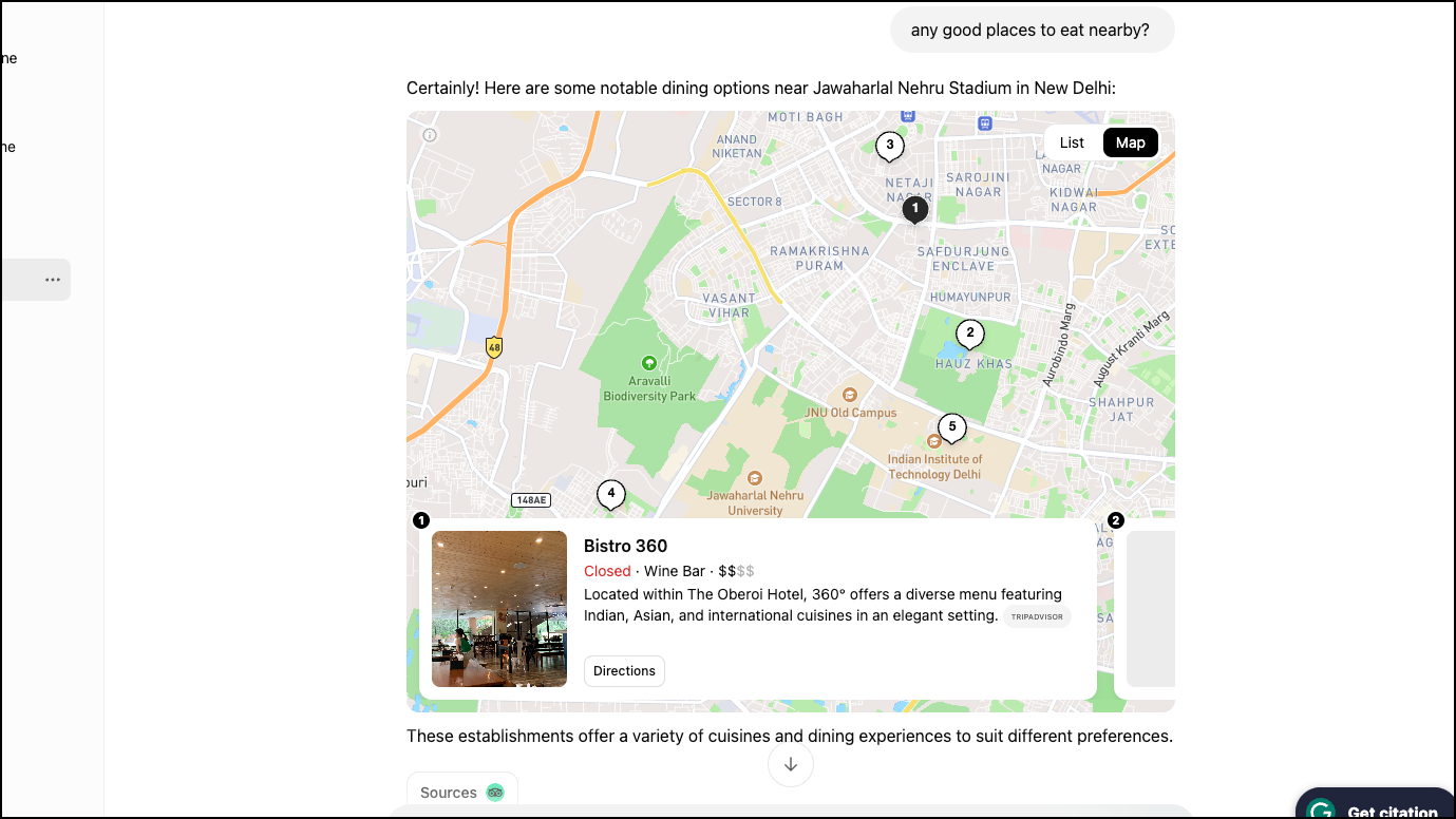 I then asked it for further information, like places to eat nearby. Now, the fact that it can retain context is amazing so you can ask follow-up questions in natural language.