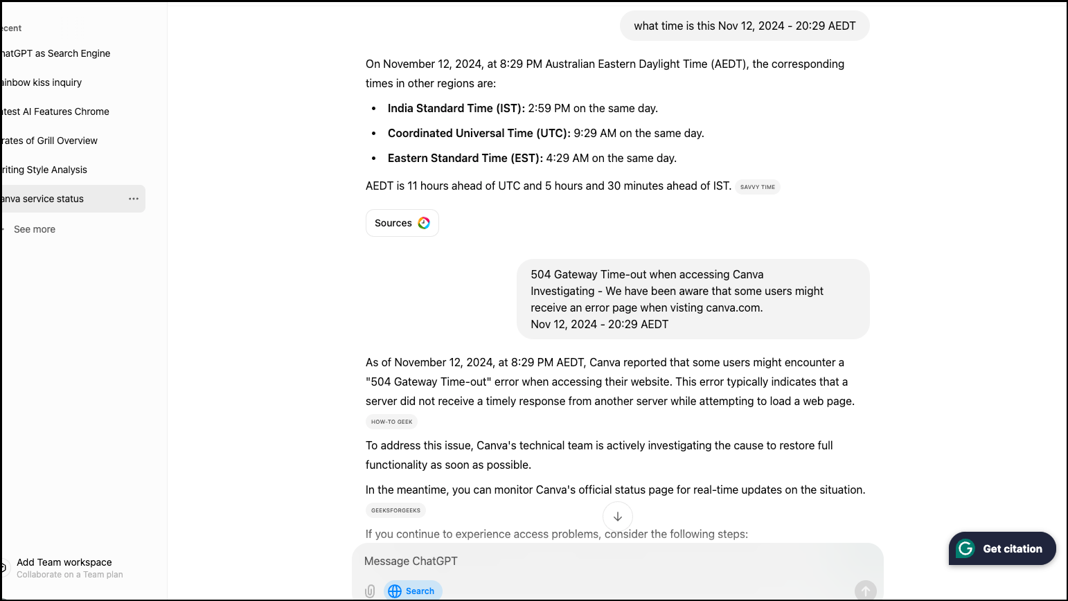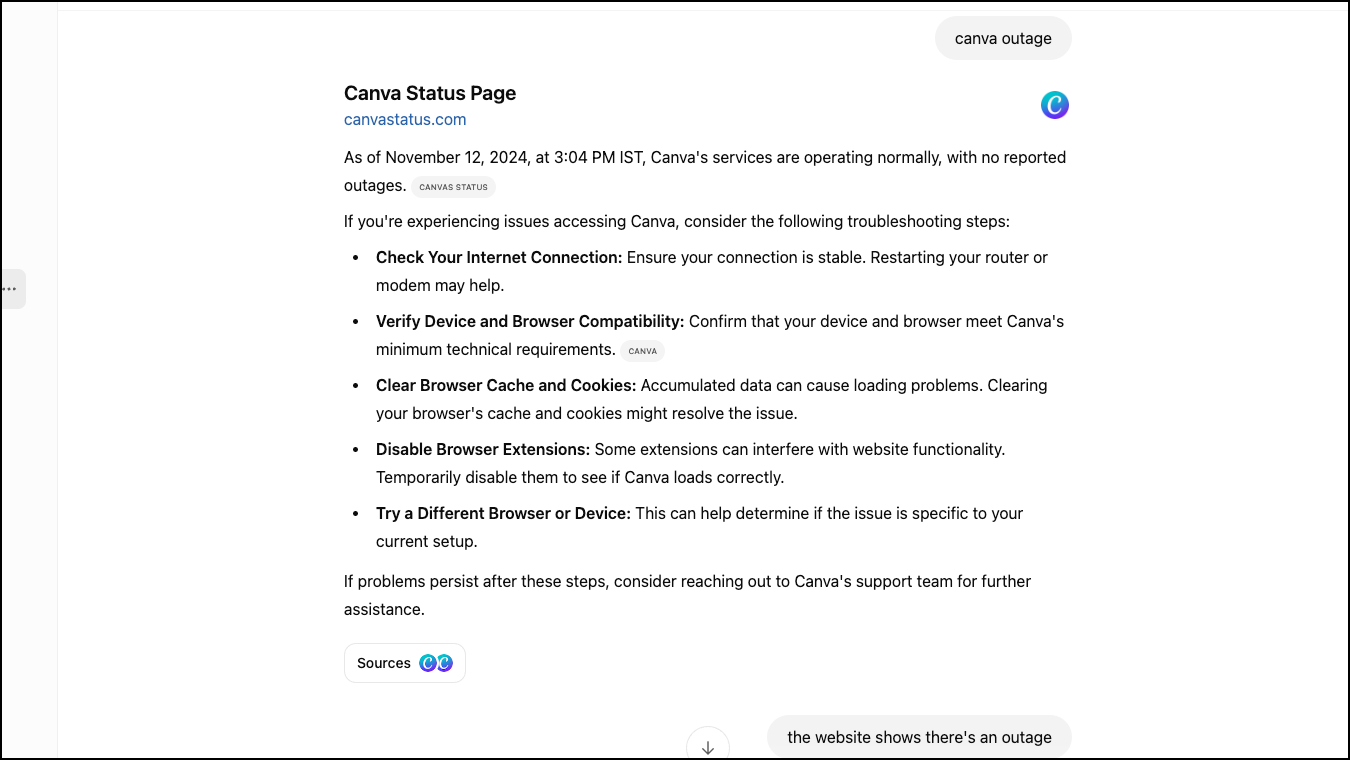 Also, it did fail to provide up-to-date information once; Canva was recently experiencing an outage and when I searched for it, ChatGPT told me it was working fine.