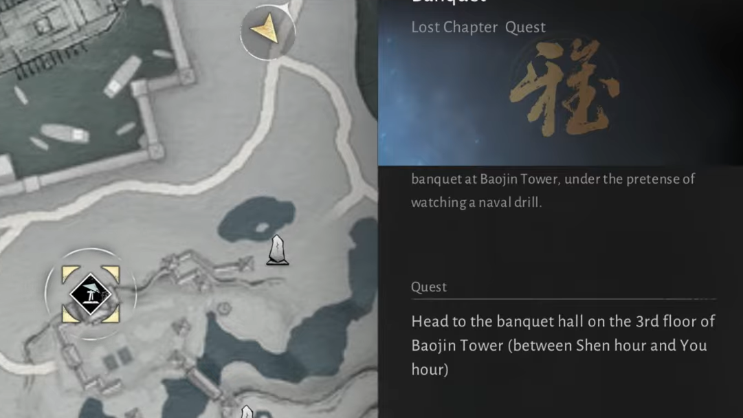 Travel to Baojin Tower and ascend to the third floor. The quest will not trigger outside the designated time window—use the in-game time adjustment menu to set the hour to Shen or You if needed.