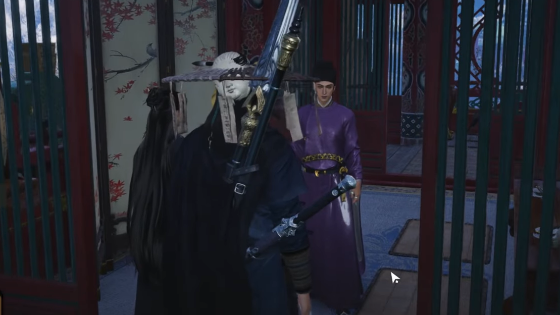 Step 2: Interact with the gold bell to trigger a cutscene with General Murong Yanzhao. After the scene, examine the painting depicting a wheelchair-bound figure. Ask the General about each painting to learn the names associated with them—these names correspond to statues you must place.