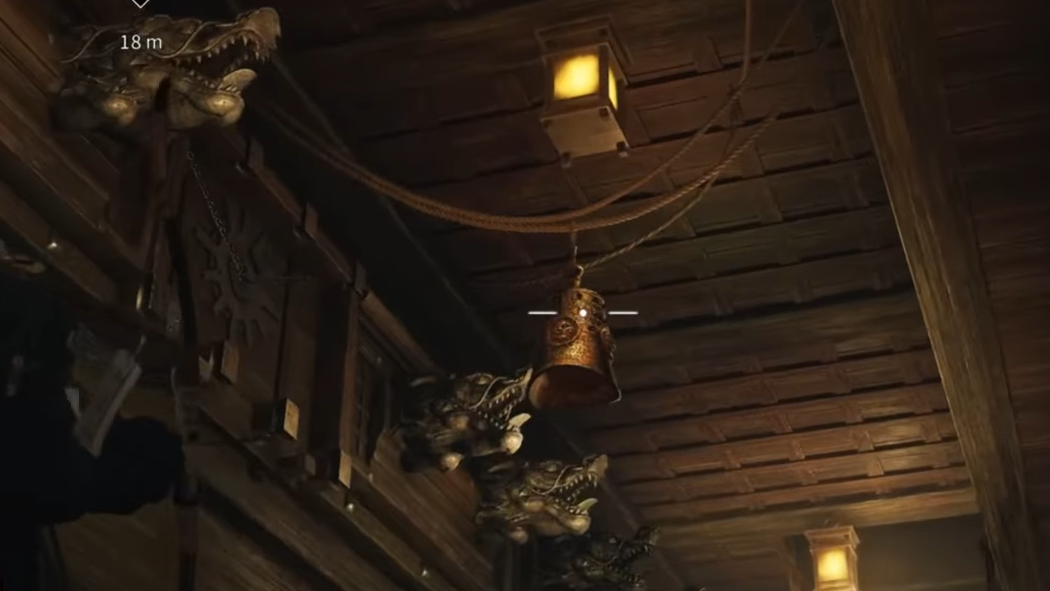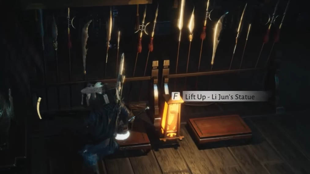 Step 4: Locate the Li Jun Statue on the left side near a lion statue and place it before the third painting (burning gravestone). To find the Murong Statue, go behind the paintings to the back room. In the right room, shoot the bell to make it resonate with the golden door knocker, then use Meridian Touch on the knocker to unlock the door.