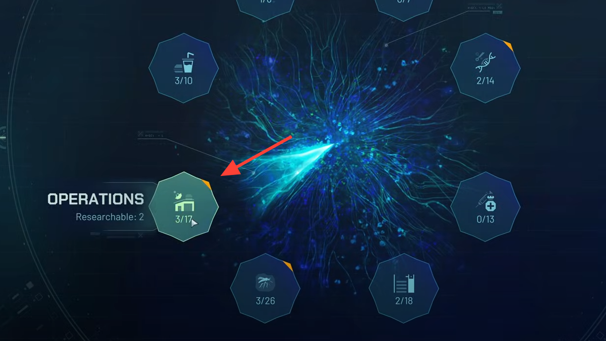 There are 113 total research nodes spread across eight areas. Understanding what lives in each bucket makes prioritization simple.