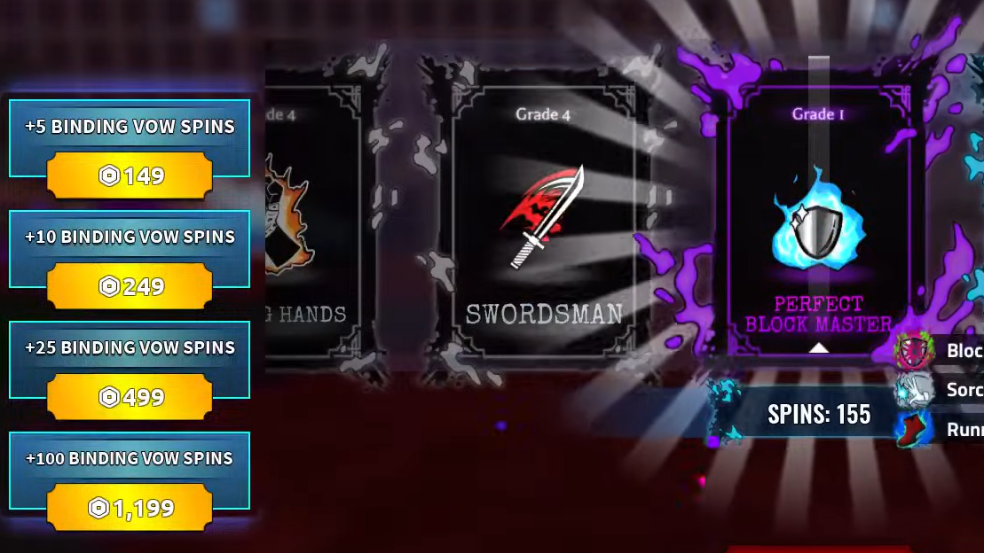 Perfect Block Master is notable because it carries no visible downside at any tier. The wider parry window, free Cursed Energy, and extended stun on successful blocks make it one of the safest vows to push to Tier 3. Movement Master is a strong PvP complement, granting two extra dashes at Tier 3 with only a moderate increase to dash stamina cost.